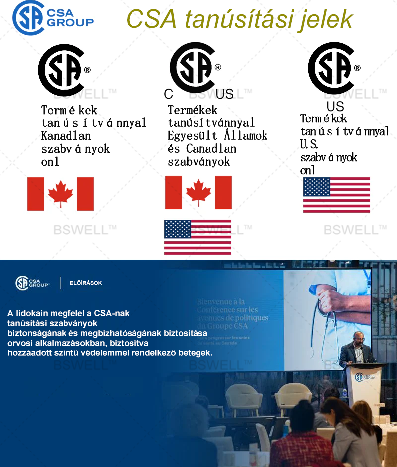 A CSA egy hivatalos tanúsító testület, amelyet a kanadai kormány engedélyezett. A termékek biztonságának, teljesítményének és minőségének legmagasabb szintű biztosítása érdekében szigorú tesztelési folyamatokon mennek keresztül. A CSA tanúsítvány világszerte elismert minőségi jelzés, amely több ágazatra is kiterjed, beleértve az orvosi, elektrotechnikai termékeket és fogyasztói cikkeket, biztosítva a fogyasztói biztonságot és a termék hatékonyságát.