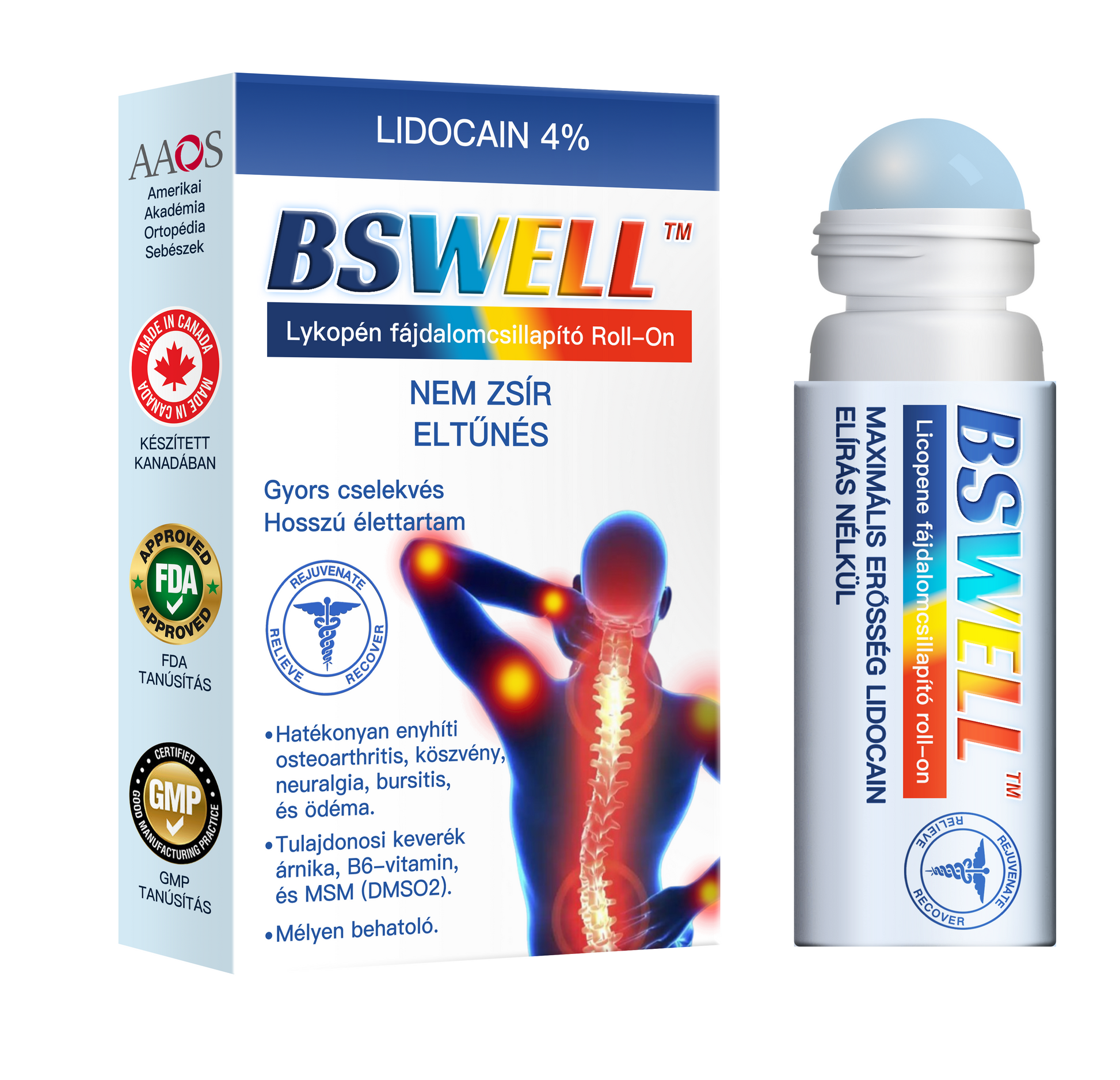 A BSWELL™ Lidocain Fájdalomcsillapító Roll-On Gél hat összetevőt tartalmaz, amelyek bizonyítottan hatékonyak az arthritis és a csontproblémák kezelésében világszerte több millió ember számára.